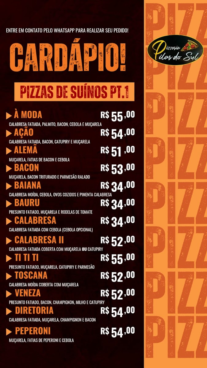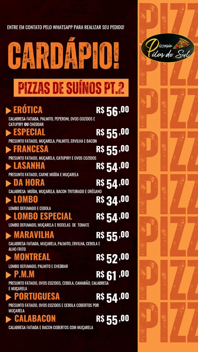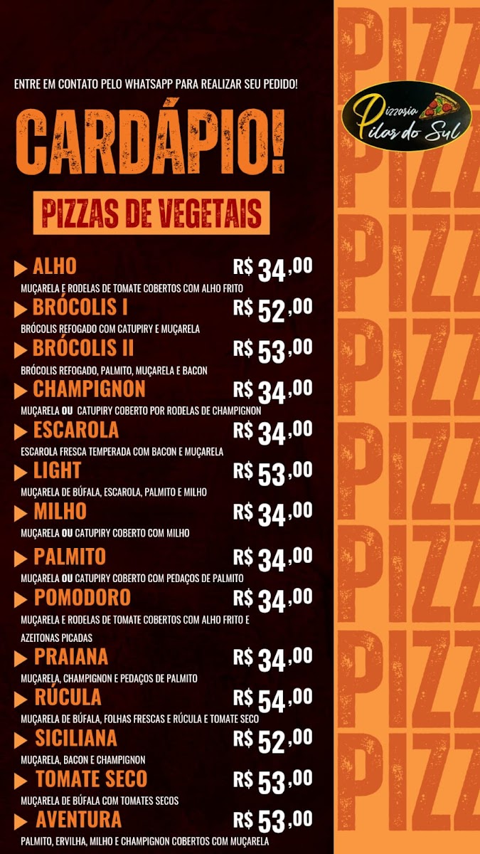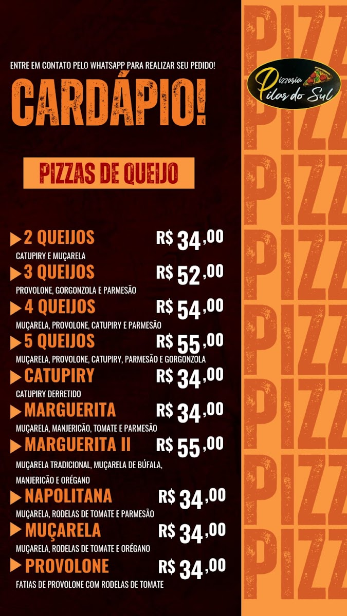 Pizzaria Pilar do Sul in São Paulo is a go-to destination for pizza lovers seeking variety and flavor. Their menu shines with diverse options, highlighting pizzas loaded with cheese, fresh vegetables, poultry, and a selection of pork specialties. Each category promises rich, well-crafted recipes that cater to different tastes, making every visit a culinary adventure.