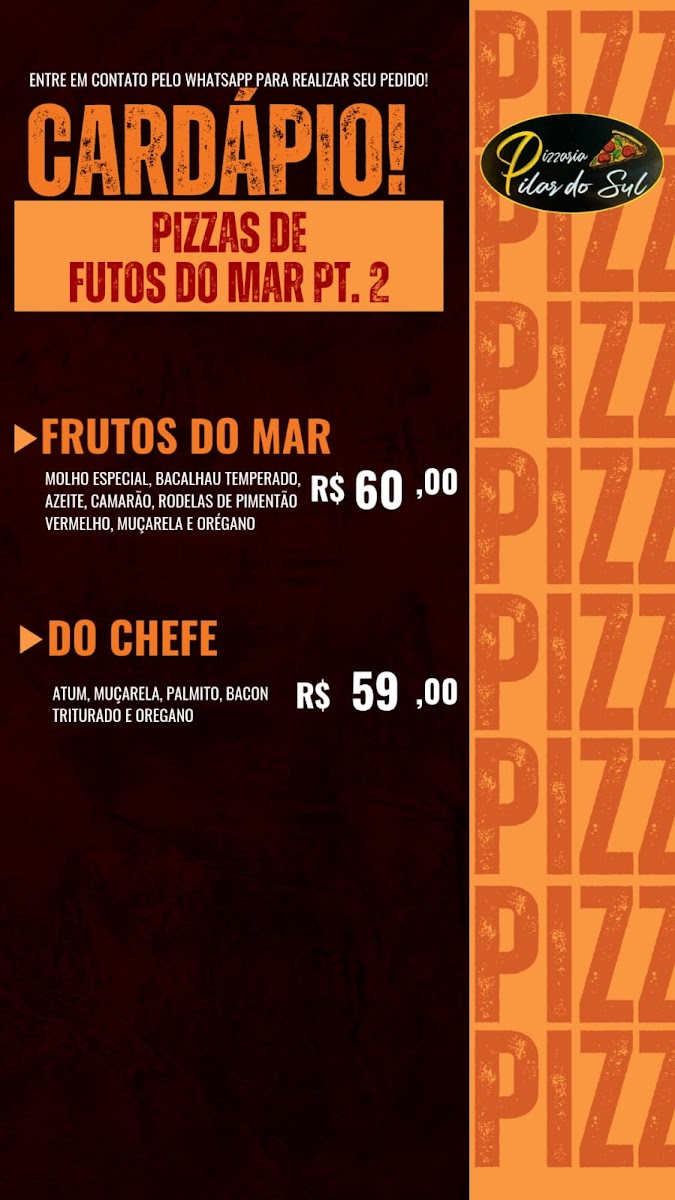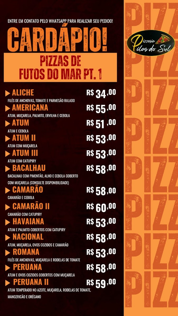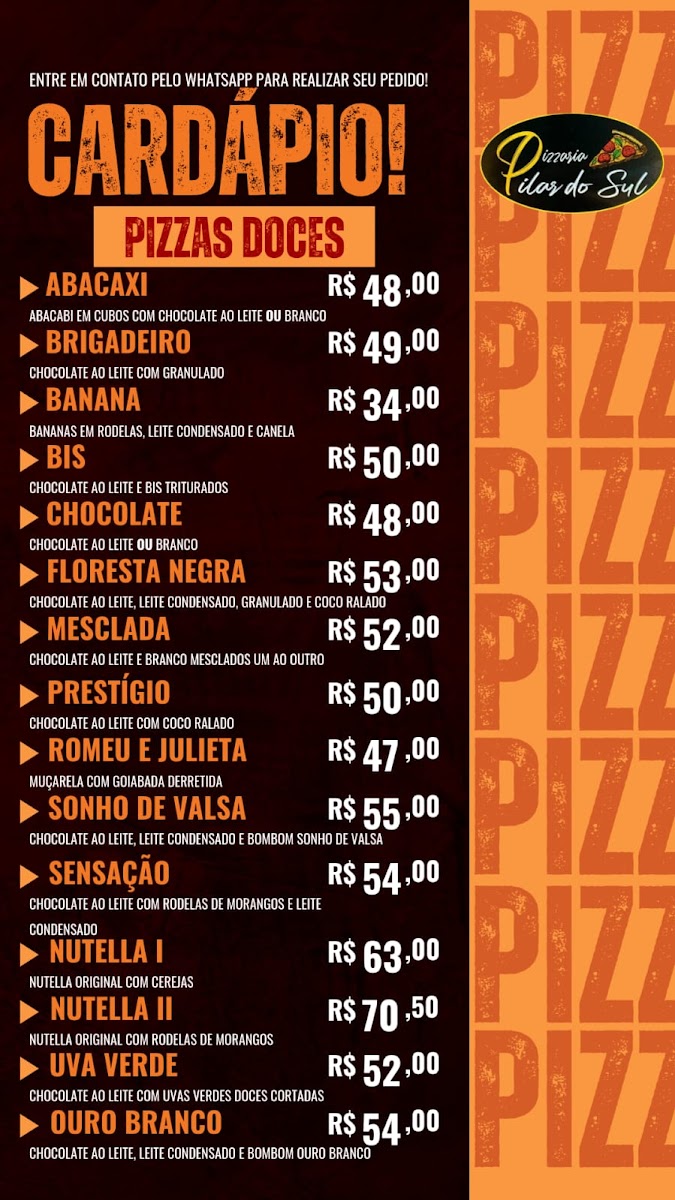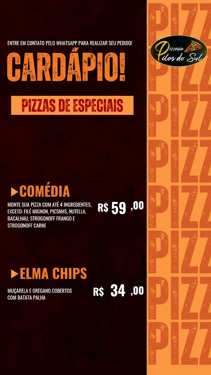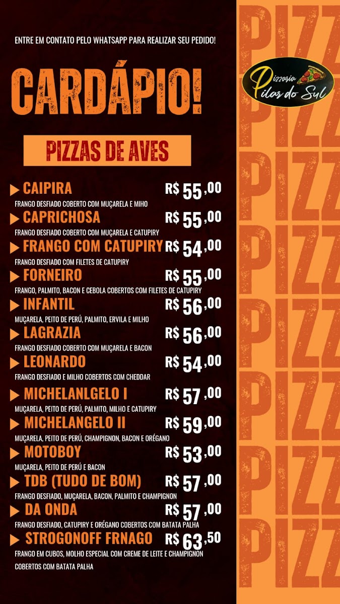 Pizzaria Pilar do Sul in São Paulo is a go-to destination for pizza lovers seeking variety and flavor. Their menu shines with diverse options, highlighting pizzas loaded with cheese, fresh vegetables, poultry, and a selection of pork specialties. Each category promises rich, well-crafted recipes that cater to different tastes, making every visit a culinary adventure.
